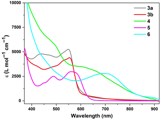 这一系列新型的碳龙配合物在紫外-可见光-近红外区域具有良好的吸收(图4),TD-DFT计算显示其吸收峰归功于HOMO→LUMO的电子跃迁。这为以后其光学应用奠定了基础。