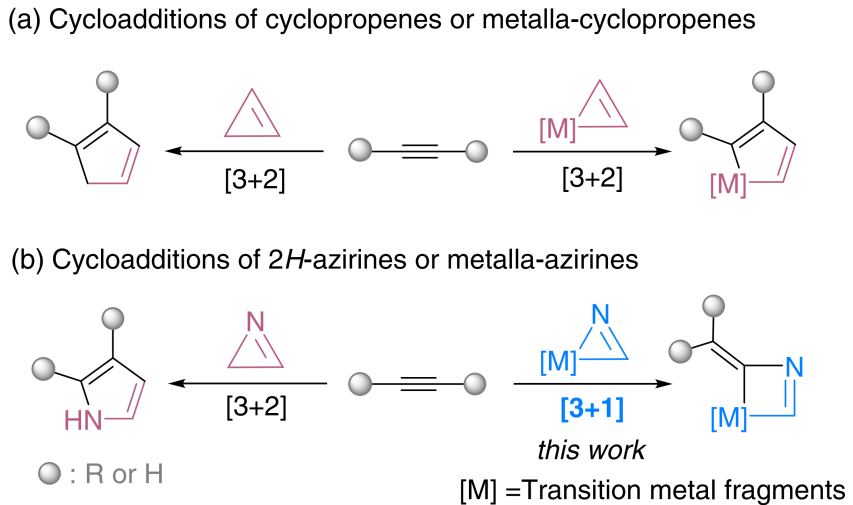 小环扩环反应在有机合成中发挥着重要应用。不饱和三元环与炔烃通常发生[3+2]环加成反应。例如环丙烯与炔烃反应生成环戊二烯化合物;金属杂环丙烯与炔烃反应生成金属杂环戊二烯化合物;氮杂环丙烯与炔烃反应可以得到吡咯化合物。而氮杂金属杂环丙烯与炔烃的反应性还未曾报道(图1)。