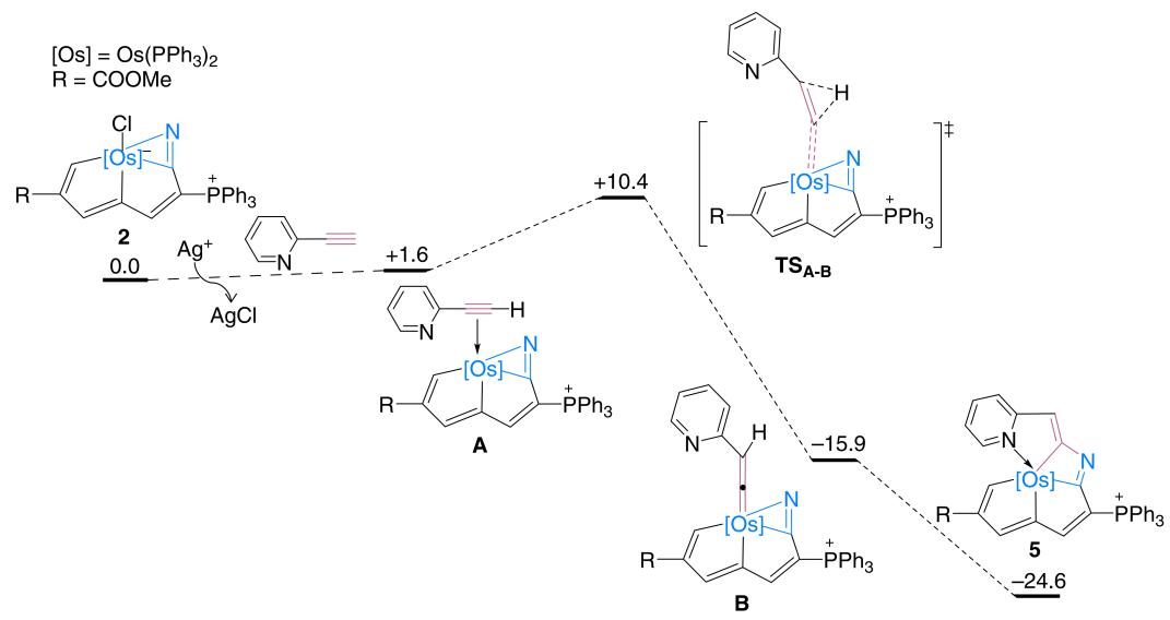 为进一步探讨反应机理,作者尝试了化合物2与各种炔烃的反应。研究发现化合物2与内炔不反应,而与不含配位杂原子的末端炔烃反应不能得到稳定产物。根据实验结果,作者通过理论计算说明该反应过程需要经过金属亚乙烯的中间体B,随后,氮杂金属杂环丙烯中的氮原子亲核进攻金属亚乙烯中a碳原子,末端炔烃的杂原子配位到金属中心,最终形成平面五齿碳龙配合物。