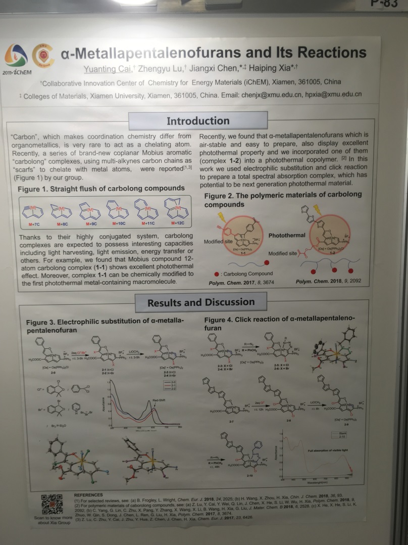 参加这次会议与我们课题组的研究领域有着密切的关系,我们研究的领域为金属有机领域的构筑金属杂稠芳环方法学及金属杂稠芳环材料的应用,为金属有机领域的重要分支。我本次会议参会所提交的会议摘要的题目是:“A Photothermal Metallapentalenofuran and Its Photothermal Metallopolymer”,并且做了相关墙报展示(附图1)。