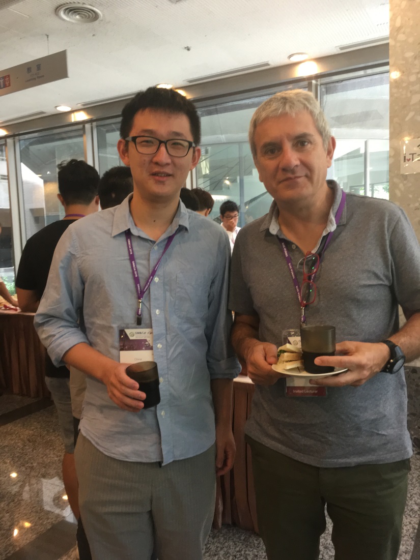 2)与我们课题组最为相关的工作包括西班牙海梅一世大学Eduardo Peris教授关于氮杂环卡宾的主客体化学研究、日本东京工业大学Jun Takaya教授关于第IB副族金属的双金属pincer体系以及做墙报展的台湾新竹清华大学蔡易州教授的Mo、Ru等金属-金属多重键的构筑。这三位教授均在墙报展示时对我们组的工作表现出了很大的兴趣。(附图2-4为我与这三位教授的合影)