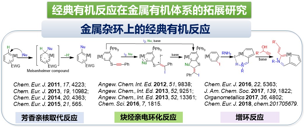 经典有机反应的发展是有机学科经久不衰的关注热点。将经典有机反应拓展至金属有机体系,有望发掘全新的金属有机试剂,发现新反应。然而金属有机化合物往往具有低热稳定性和对空气、水份敏感等特征,难以研究其经典有机反应。我们以一系列具有一定稳定性和高化学反应活性的金属有机化合物为底物,将若干重要的经典有机反应拓展到金属有机体系(图1),发展了简单高效的杂环构筑及其化学转化方法,且通过中间体的捕捉,修正或进一步明晰了一些经典有机反应的机理,并藉此构筑了若干全新的杂环分子骨架: