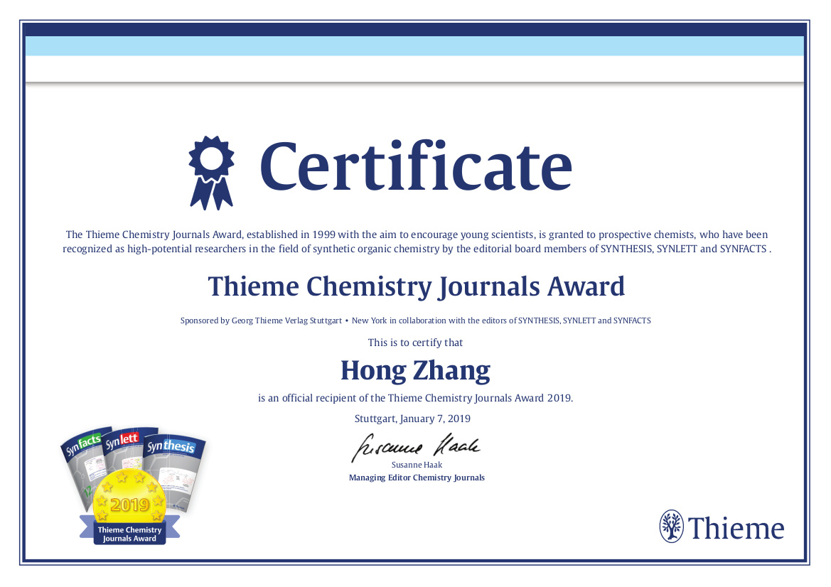 Prof. Hong Zhang received the prestigious Thieme Chemistry Journals Award in 2019.