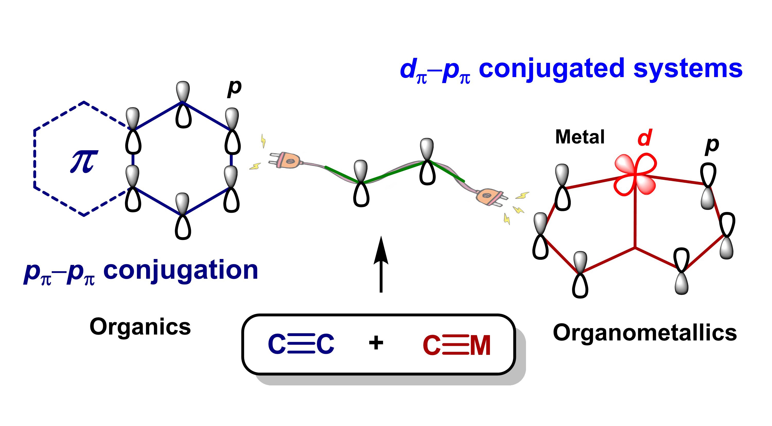 The metal-carbon triple bonds and carbon-carbon triple bonds are both highly unsaturated bonds. As a result, their reactions tend to afford cycloaddition intermediates or products. Herein, we report a reaction of M≡C and C≡C bonds that affords acyclic addition products. These newly discovered reactions are highly efficient, regio- and stereospecific, with good functional group tolerance, and are robust under air at room temperature. The isotope labeling NMR experiments and theoretical calculations reveal the reaction mechanism. Employing these reactions, functionalized dπ-pπ conjugated systems can be easily constructed and modified. The resulting dπ-pπ conjugated systems were found to be good electron transport layer materials in organic solar cells, with power conversion efficiency up to 16.28% based on the PM6: Y6 non-fullerene system. This work provides a facile, efficient methodology for the preparation of dπ-pπ conjugated systems for use in functional materials.
