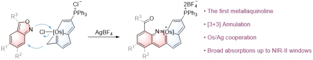 The structural design and tuning of properties of metallaaromatics are crucial in materials and energy science. Herein, we describe the rapid synthesis of tetracyclic metallaaromatics containing quinoline and pentalene motifs fused by a metal-bridged fragment. These unique compounds display remarkably broad absorption, enabling for the first time the absorption of metallaaromatics to reach the second near-infrared (NIR-II) bio-window. The formation of osmaquinoline unit involves an unconventional C(sp2)−C(sp3) coupling promoted by AgBF4 to achieve [3+3] cycloaddition. The introduction of cyclic dπ-pπ conjugation and extension of the aromatic π-framework can effectively shrink the HOMO–LUMO gap, thus broadening the absorption window. The considerable photothermal conversion efficiency (PCE) in both the NIR-I and NIR-II windows, the high photothermal stability and the excellent electrochemical behavior suggest many potential applications of these condensed metallaquinolines.