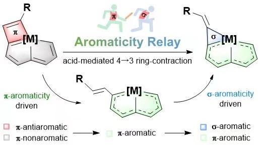 π-Aromaticity is an important driving force in directing the synthesis of aromatic compounds; in contrast, reactions induced by σ-aromaticity are uncommon. Here we report a strategy based on π- and σ-aromaticity relays to realize the structurally defined ring contraction of metallacyclobutadiene to metallacyclopropene. This reaction involves the release of the π-antiaromaticity of metallacyclobutadiene to afford a π-aromatic intermediate, followed by ring reclosure to generate σ-aromatic metallacyclopropene. The ring opening–reclosing mechanism and versatile switching of the aromaticity of the metallacyclic species are supported by experimental results and theoretical calculations. This work demonstrates the importance of aromaticity relay with the successive decrease of energy in reactions and will stimulate efforts in exploiting the vital role of aromaticity in synthetic chemistry.