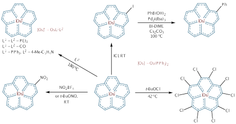 The planar metallo-annulene exhibits robust stability, remaining air-stable at 240°C, and showing reversible electrochemistry behavior akin to ferrocene. It also features a unique photoresponse, displaying aggregation-induced emission (AIE) with visible red light under UV irradiation. In addition, the molecule offers versatile derivatization, undergoing nitration, iodination, and full-chlorination in its annulene plane, as well as axial ligand substitution (Figure 4), positioning it as a building block for two- and three-dimensional materials.